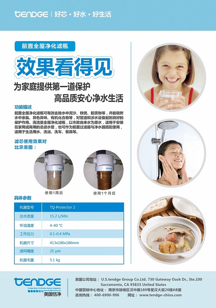 恬凈前置全屋凈化濾瓶TQ-P2能有效去除水中的懸浮物、鐵銹、顆粒雜質(zhì)、余氯、異色異味,它采用FDA食品級(jí)材質(zhì),高精度過(guò)濾濾芯,體積小巧,安裝方便。恬凈前置全屋凈化濾瓶TQ-P2能承受高水壓,流量超大,智能濾芯提醒功能,節(jié)能環(huán)保。